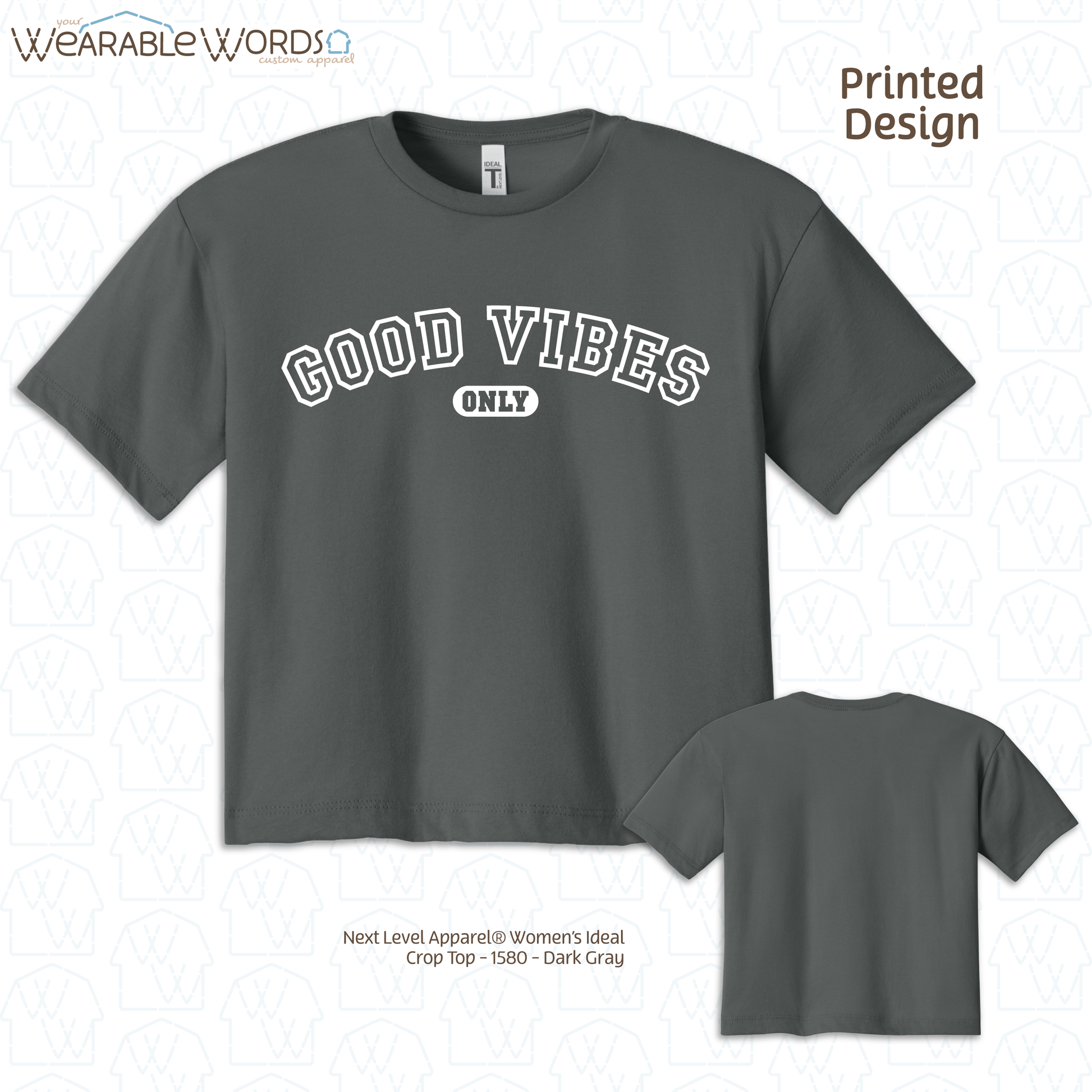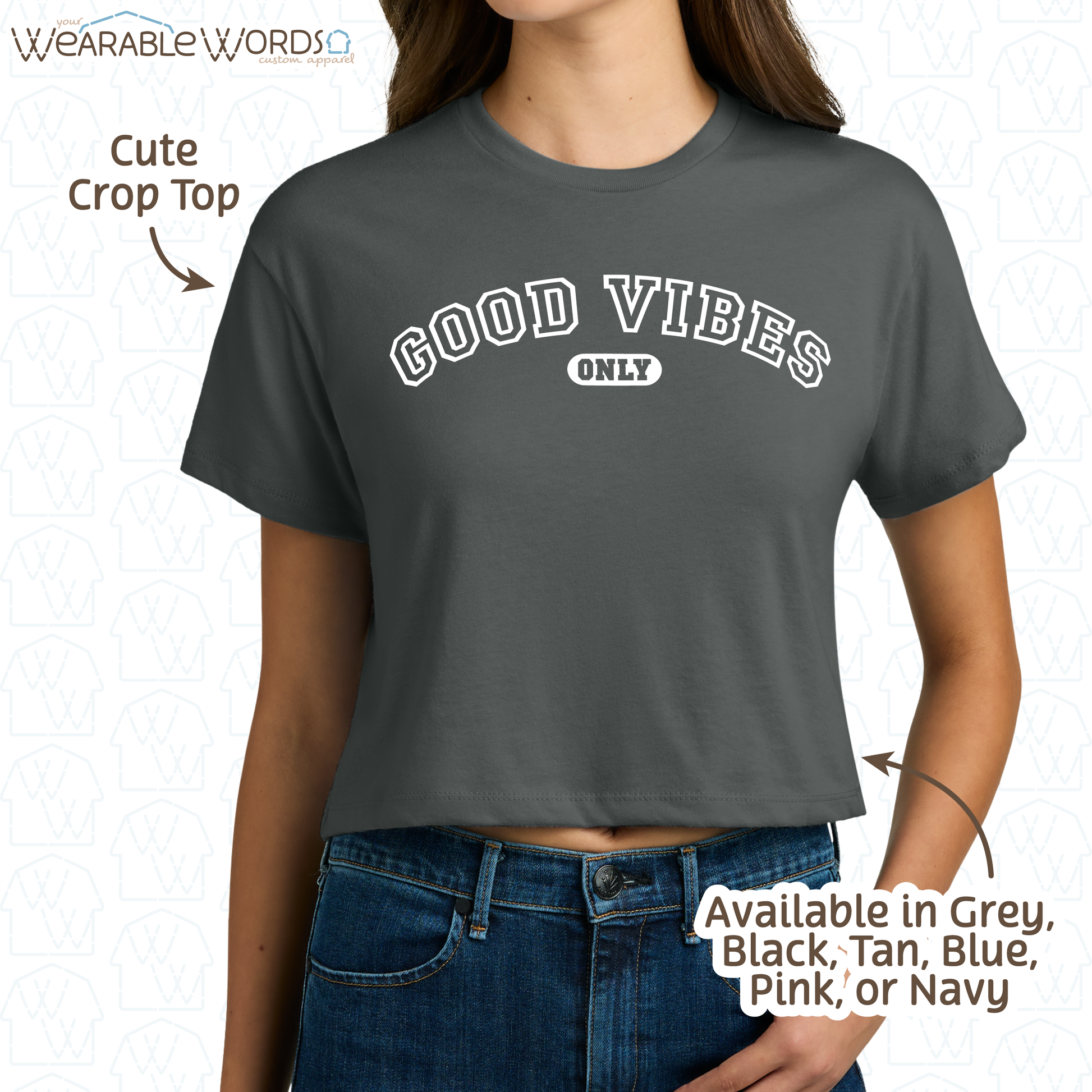 Good Vibes Only Crop Top | Varsity Style Print | Grey, Black, Blue, Pink, Tan, or Navy Women's Graphic Tee