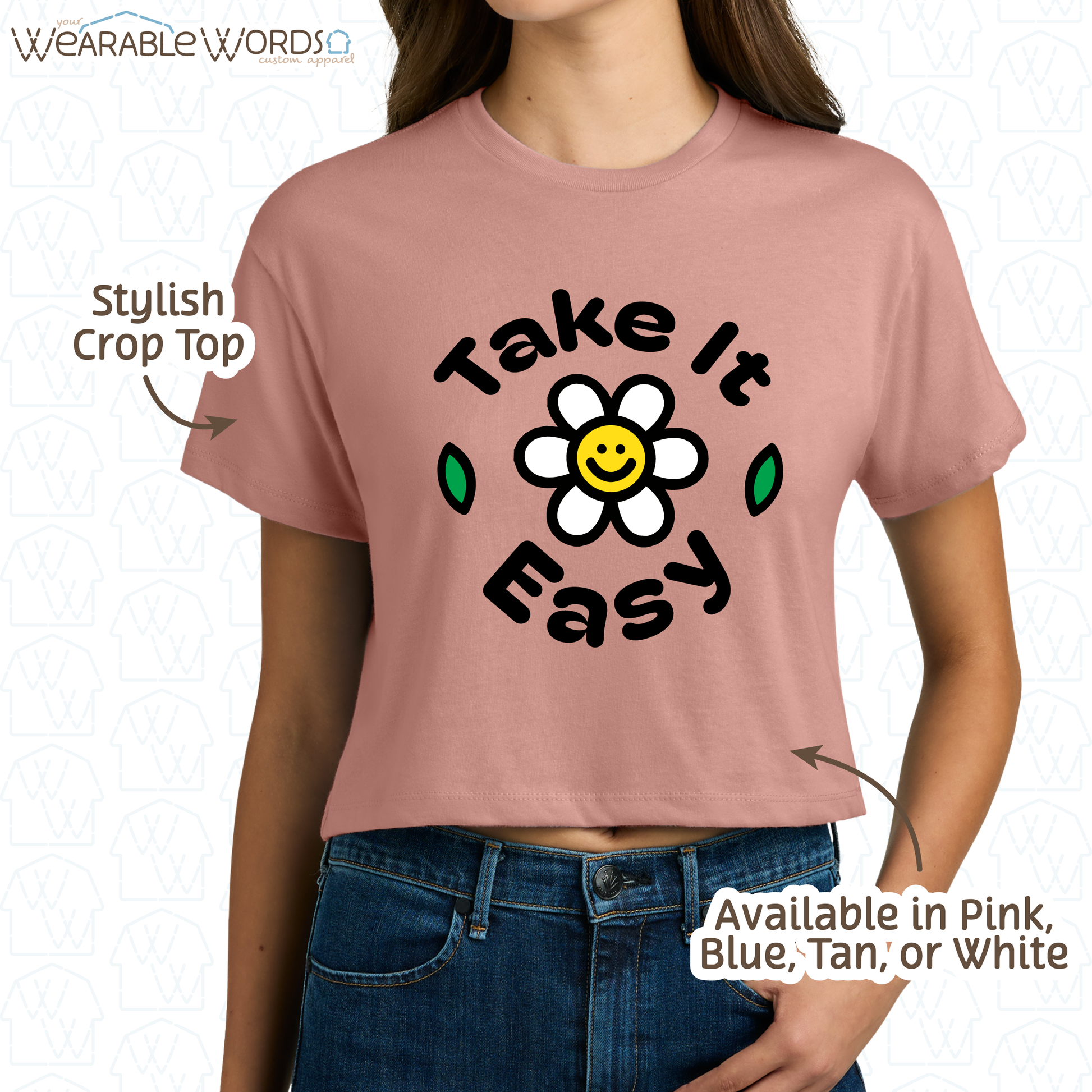 Take It Easy Crop Top | Fun Daisy Print | Blue, White, Tan, or Pink Women's Graphic Tee